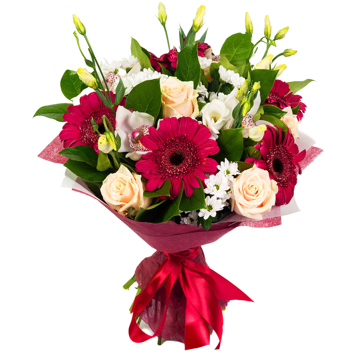 Гербера розовая, роза одноголовая кремовая, эустома белая, орхидея белая, хризантема кустовая розовая. Упаковка (лента, пленка, крафт, сетка, пленка матовая)
