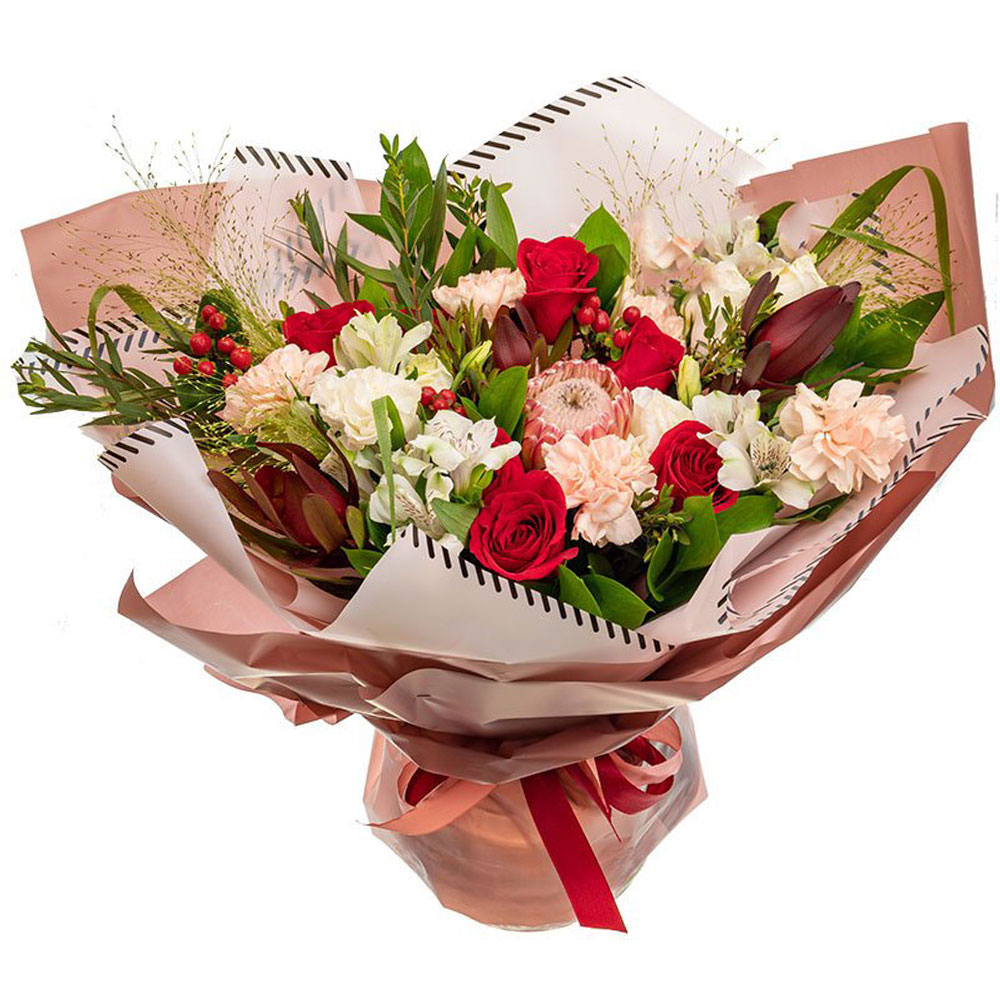 Роза одноголовая красная, протея, альстромерия белая, гиперикум, гвоздика нежно-розовая, фисташка, зелень. Упаковка (лента, пленка, крафт, сетка, пленка матовая)