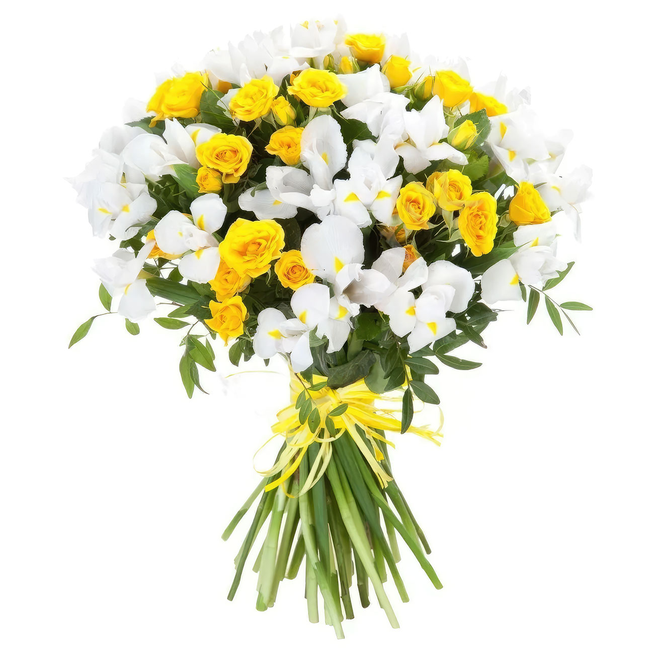 Ирис белый, роза кустовая желтая, фистация. Упаковка (лента, пленка, крафт, сетка, пленка матовая)