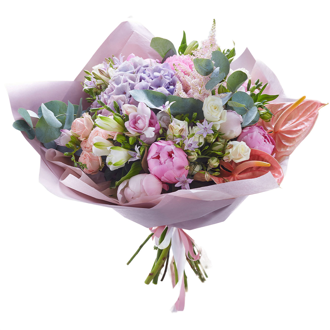 Клематис, альстромерия сиреневая, астильба, гортензия сиреневая, роза кустовая розовая и белая, антуриум персиковый, пион розовый, эвкалипт. Упаковка (лента, пленка, крафт, сетка, пленка матовая)