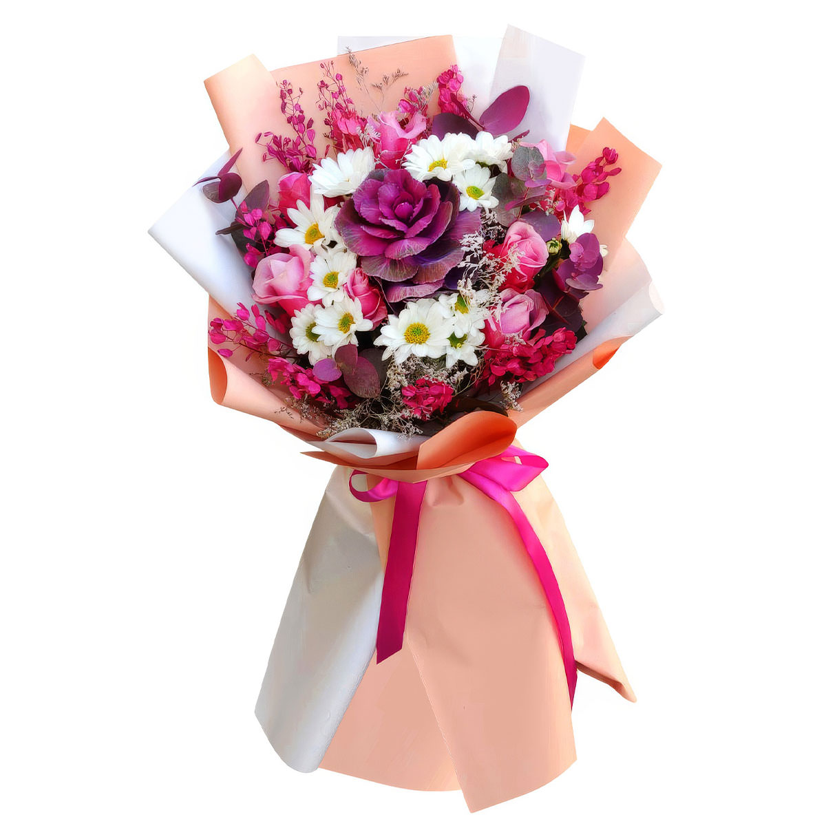 Брассика, хризантема кустовая белая, роза одноголовая розовая, лунария розовая, эвкалипт. Упаковка (лента, пленка, крафт, сетка, пленка матовая)