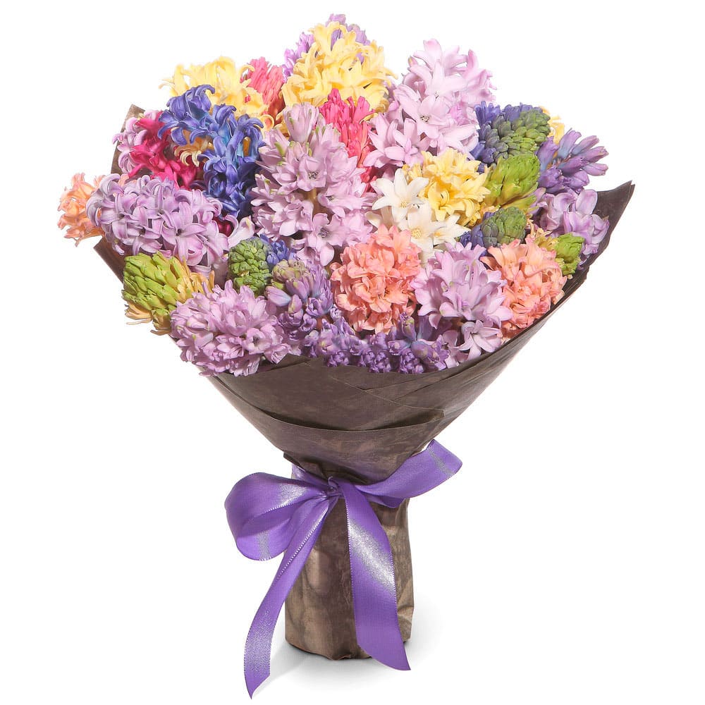 Гиацинт микс (белый, желтый, сиреневый, персиковый, розовый). Упаковка (лента, пленка, крафт, сетка, пленка матовая)
