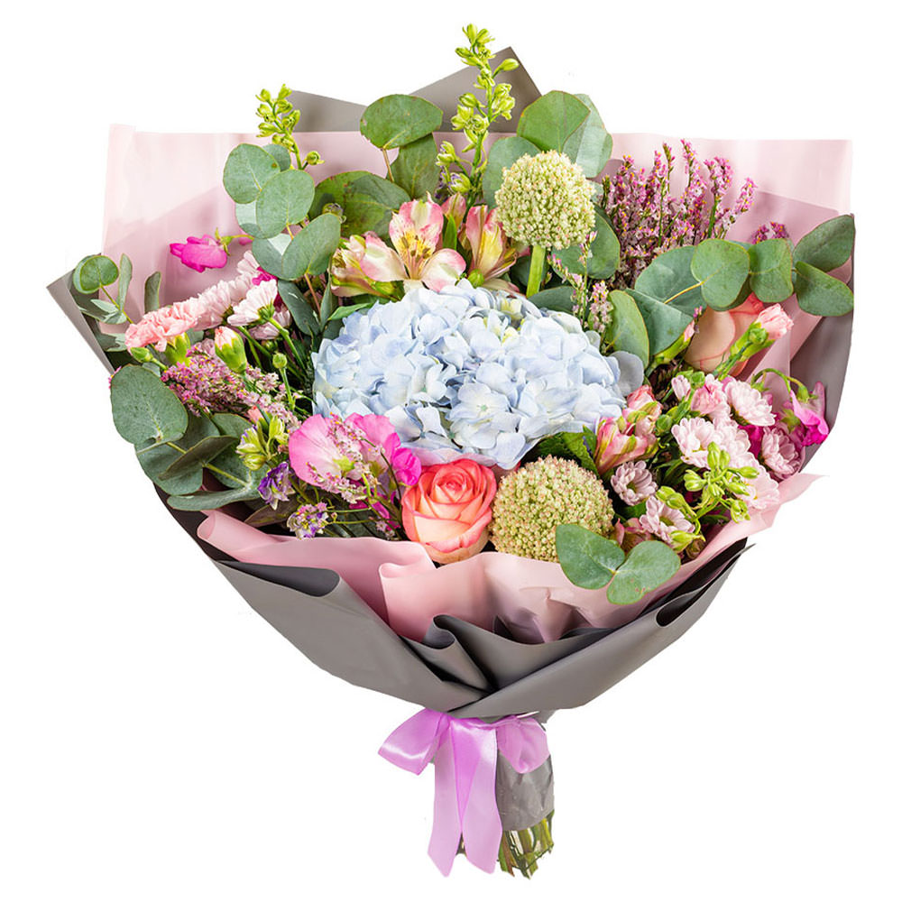 Гортензия голубая, роза одноголовая розовая, альстромерия розовая, хризантема кустовая нежно-розовая, эвкалипт, озотамнус. Упаковка (лента, пленка, крафт, сетка, пленка матовая)