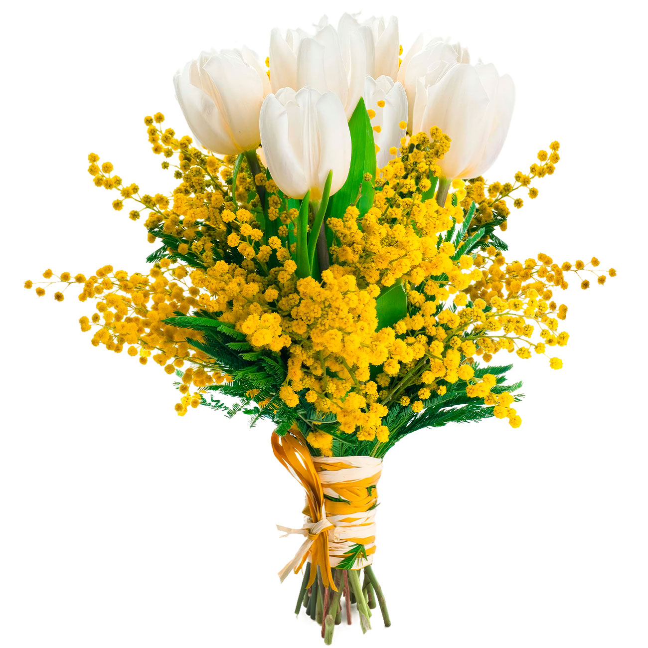 Мимоза, тюльпан белый, зелень. Упаковка (лента, пленка, крафт, сетка, пленка матовая)