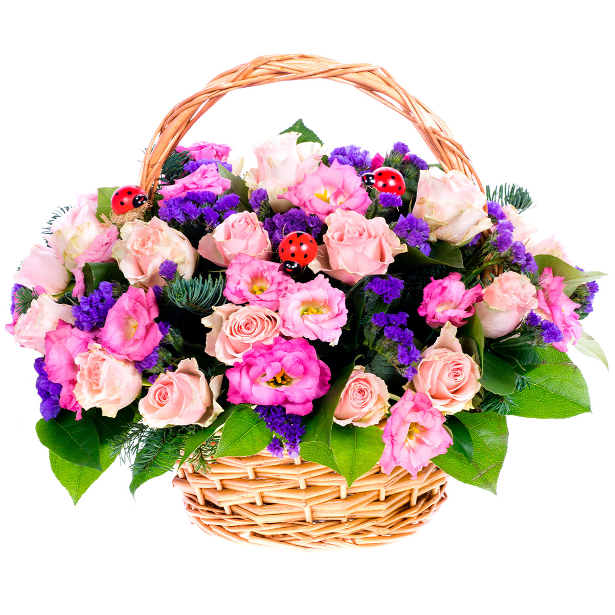 Роза одноголовая розовая, эустома розовая, статица, пихта. Упаковка (Корзина, оазис, ящик).