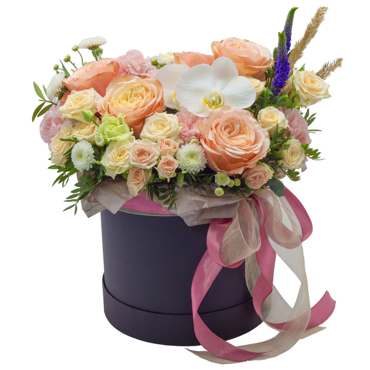 Орхидея белая, роза одноголовая персиковая, роза кустовая кремовая, хризантема кустовая мини белая, эустома зеленая и розовая, гвоздика розовая, вероника, сухоцвет. Упаковка (шляпная коробка, квадратный бокс, коробка сердце, оазис)