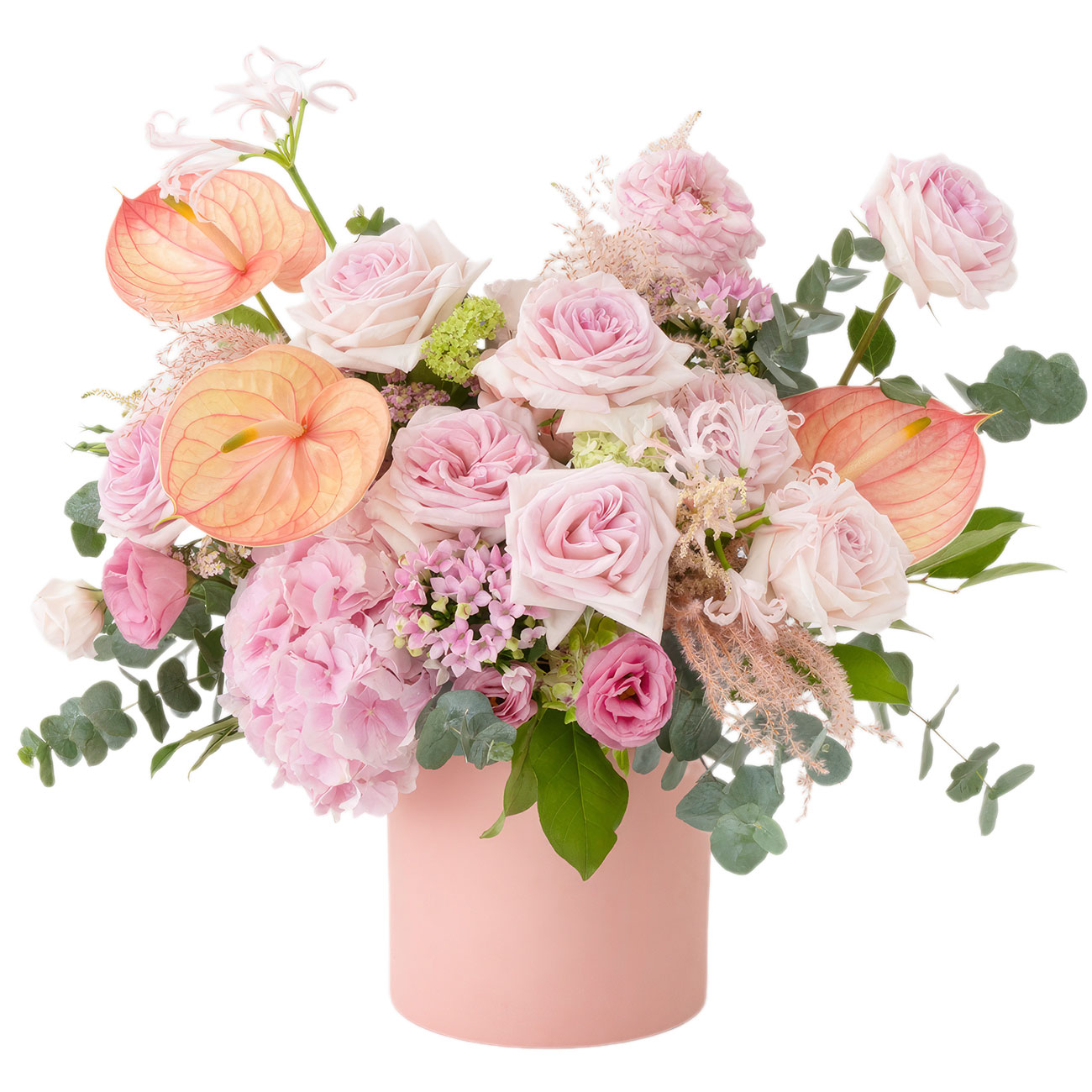 Роза одноголовая кенийская розовая, розовый голландский крестоцвет, фламинго-лилия голландская персиковая, роза розовая сорта «Аваланж», нерина розовая, гортензия розовая, эвкалипт. Упаковка (шляпная коробка, квадратный бокс, коробка сердце, оазис)