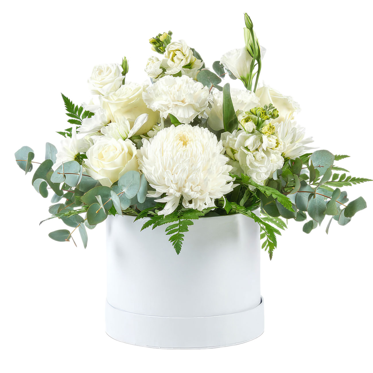 Хризантема одноголовая белая, роза одноголовая белая, диантус белый, маттиола белая, альстромерия белая, эвкалипт, папоротник. Упаковка (шляпная коробка, квадратный бокс, коробка сердце, оазис)
