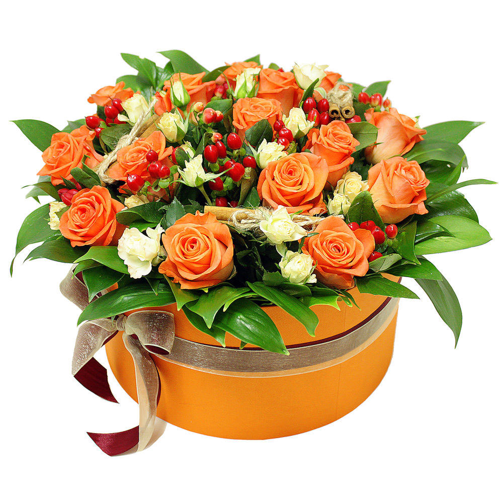 Цветы в коробке «Оранжевый закат» с доставкой по г Радужный (Владимирская обл): вы можете заказать букет в салоне цветов «Флормания» по цене от 2890 руб.